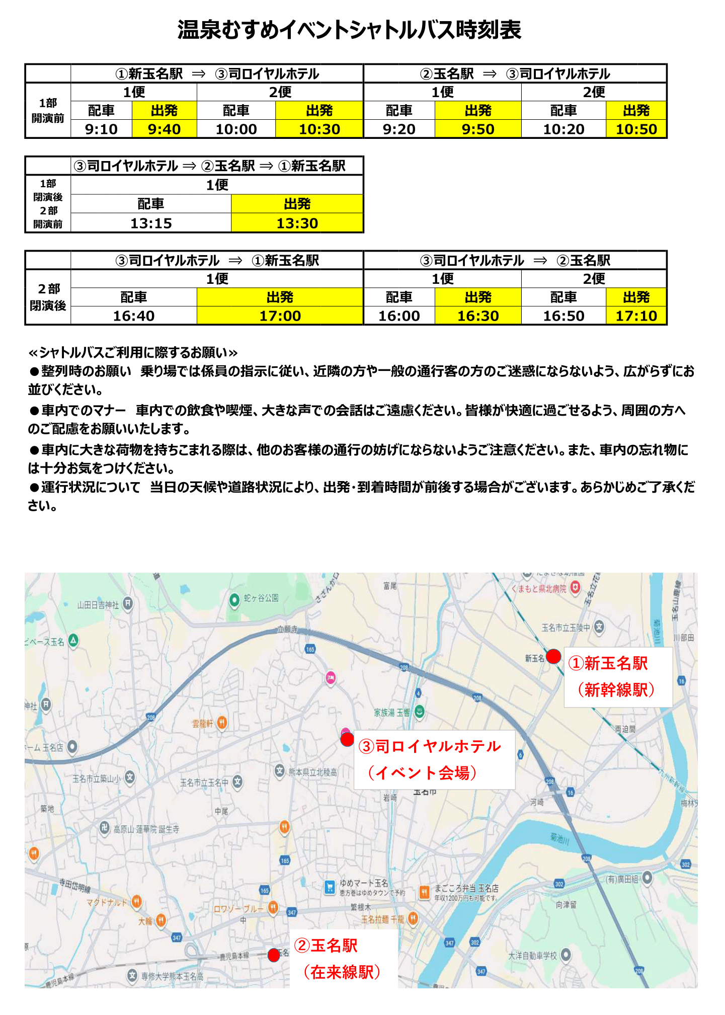 1月25日(日)、新玉名駅・玉名駅と会場となる司ロイヤルホテルを結ぶ「無料シャトルバス」の運行が決定いたしました!
