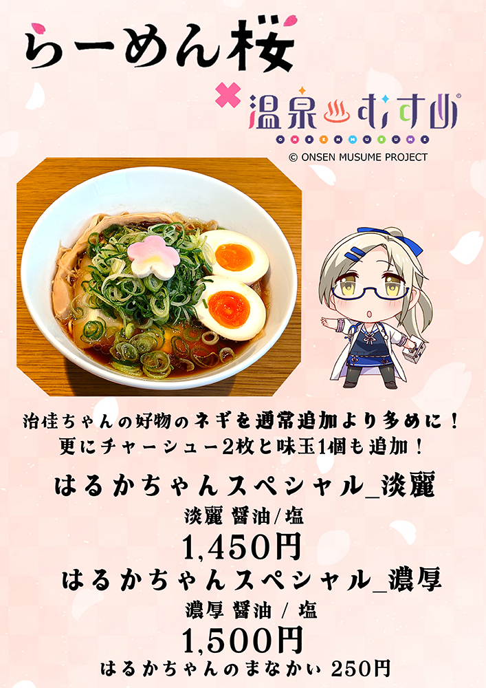 2月16日(月)より、四万温泉落合通りにある「らーめん桜」にて「四万治佳」コラボメニュー「はるかちゃんスペシャル_淡麗」と「はるかちゃんスペシャル_濃厚」の販売開始します!