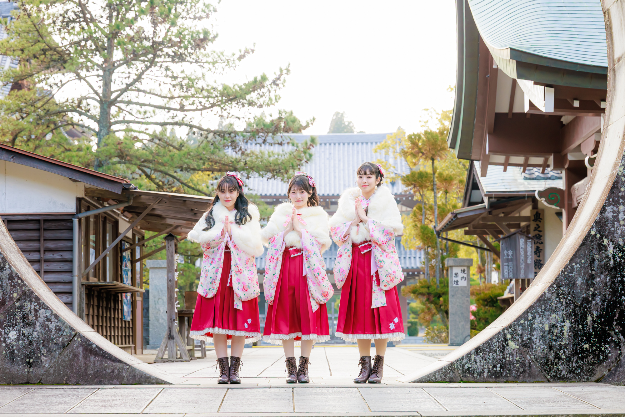 〇「蓮華院誕生寺 奥之院」重さ約37.5tの大きな飛龍の鐘を前に手を合わせる。青木陽菜・奥野香耶・佐藤日向