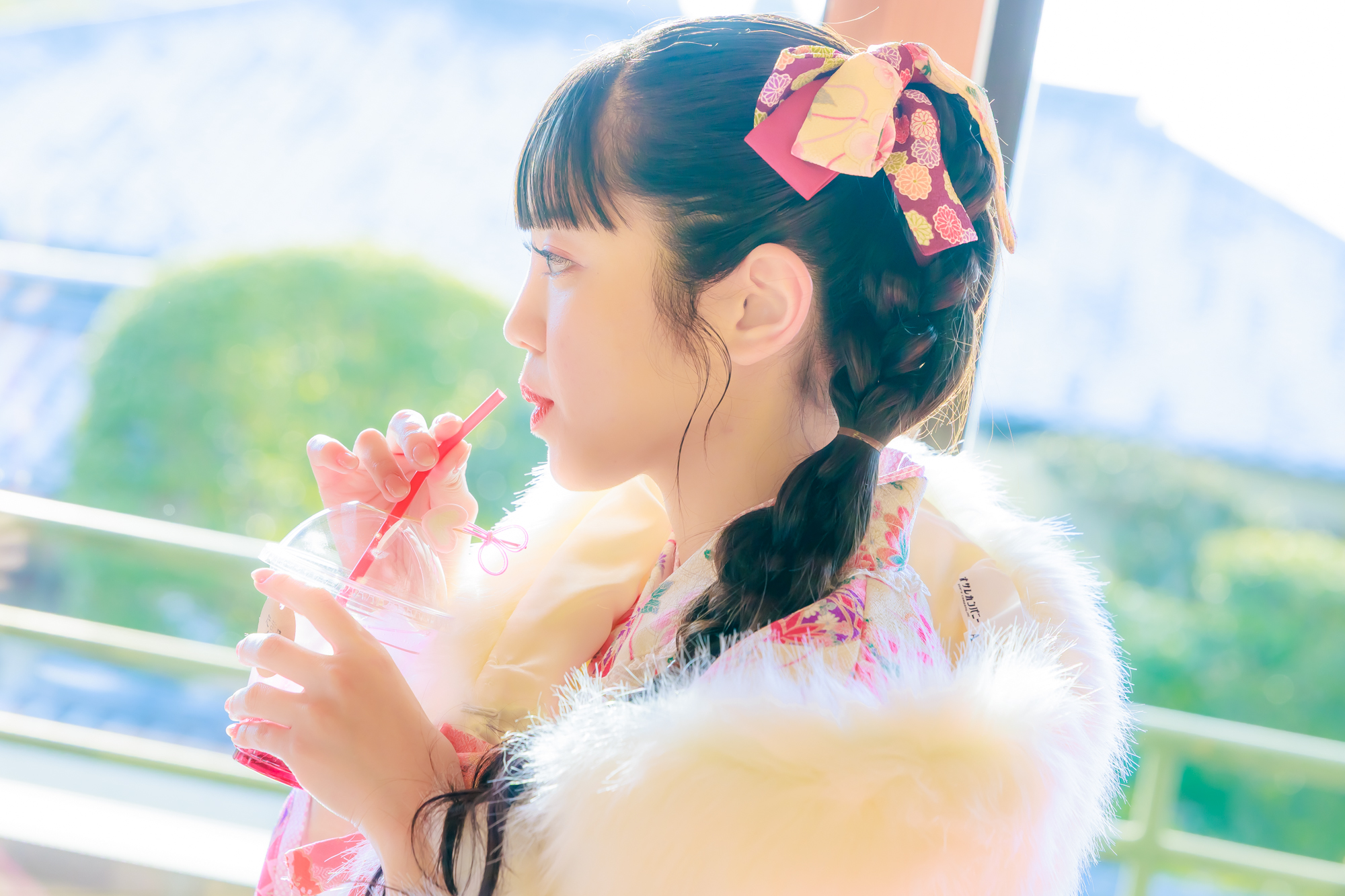 ▲窓からの景色を眺めながら、冷たいドリンクでほっと一息。ロケならではのリラックスタイムです。